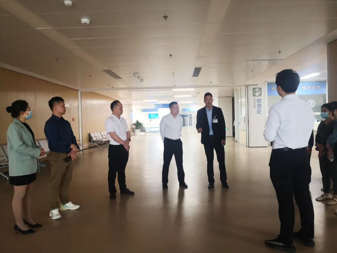 ▲在候诊大厅,该院副院长张新斐(右一)详细介绍医院建设规模