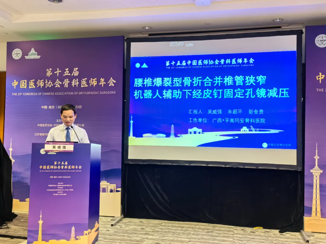 在学术会上,该院副院长、脊柱专家吴威强作题为《腰椎爆裂型骨折合并椎管狭窄机器人辅助下经皮钉固定孔镜减压》及《颈椎零切迹融合器的应用》的专题报告,重点介绍该院自引进脊柱机器人一年多来在临床应用中取得的丰硕成果,两课题切合会议主题,侧重高新科技智能化的转换应用,深受与会业内专家学者的高度关注。
