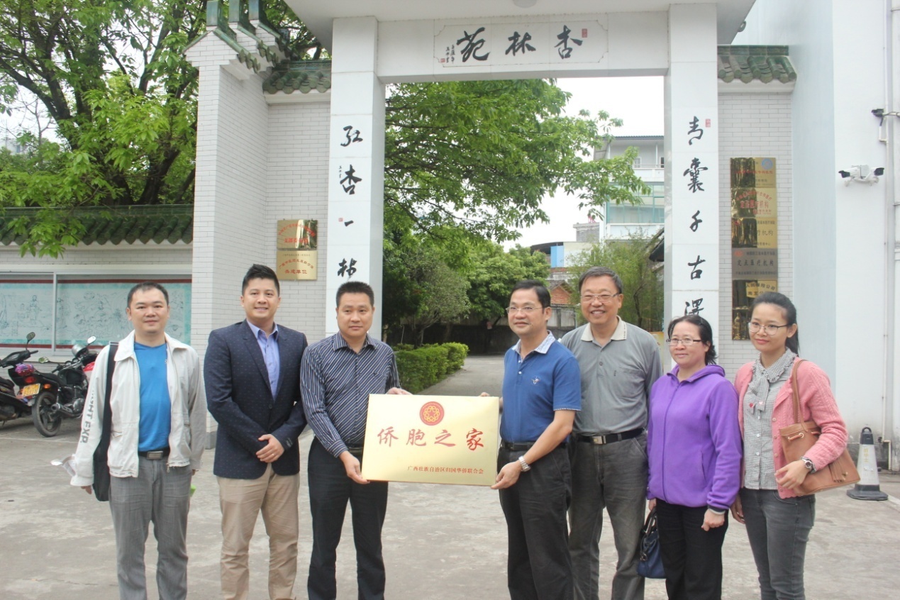 ▲贵港市侨联主席李靖毅(右二)、港北区侨联主席莫浩驱(左二)、覃塘区侨联主席李珍芳(左三)、港南区侨联副主席李京珊(左一)、平南县侨联主席王宙(右一)