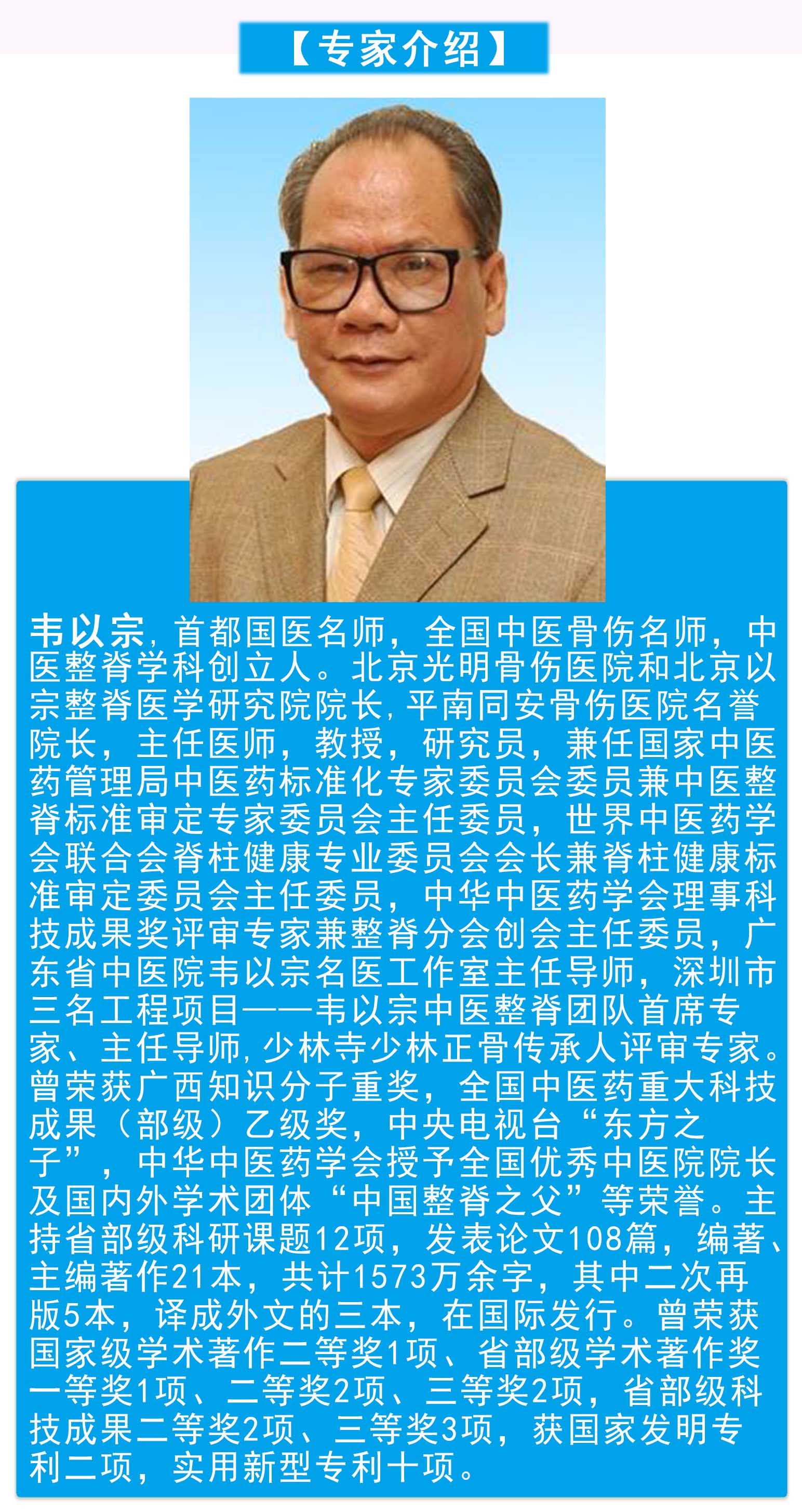 韦以宗教授出生广西平南,是从基层走出去的名医,从医54年,他一直专注中医整脊学科的研究和发展。韦以宗教授桃李满天下,平南同安骨伤医院创始人吴宁是他的弟子之一。韦以宗教授对吴宁倾心授受,经常带着他到世界各地中医讲堂上授课、巡(义)诊,以理论结合实践传授中医整脊精髓和少林正骨文化。2011年韦以宗教授主编、吴宁副主编《韦以宗整脊手法图谱》并发表,这本书是韦以宗教授多年研究中医整脊学的结晶之作。吴宁学有所成之际,与韦以宗教授、少林寺监院释延琳一起合力整理出《少林正骨》,大力推动少林正骨文化、技术传播的同时,也使得同安骨伤医院的少林正骨治疗体系更为完善。