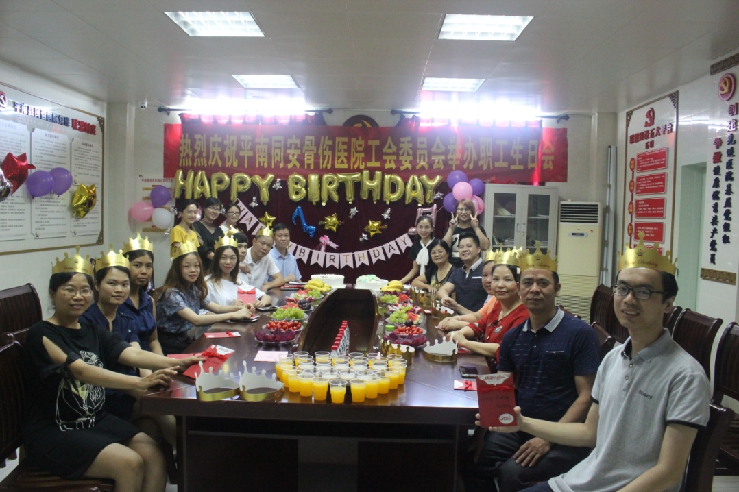 平南同安骨伤医院非常注重企业文化的建设,一直秉承“感恩敬业•厚德同安”的文化理念,倡导人性化管理,致力打造大家庭般温馨的企业环境,让每位员工时刻感受到温暖与关怀。6月29日,平南同安骨伤医院工会委员会组织本院6月份生日的员工欢聚一堂,集体庆祝自己的生日。一个生日蛋糕,一张生日贺卡,一声生日祝福,形式虽然简单,却体现了医院工会委员会对员工的关怀和祝福。