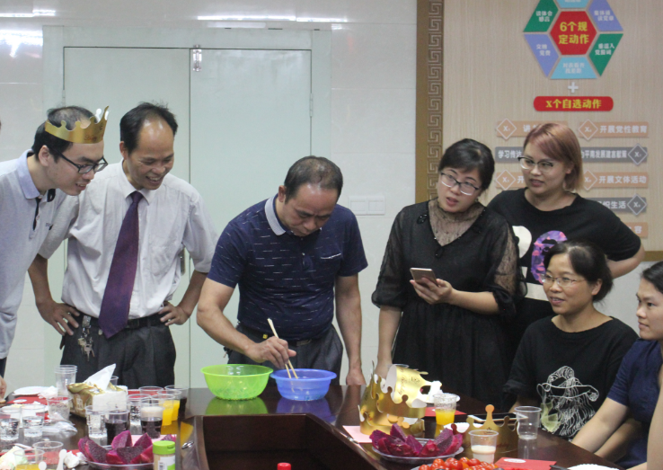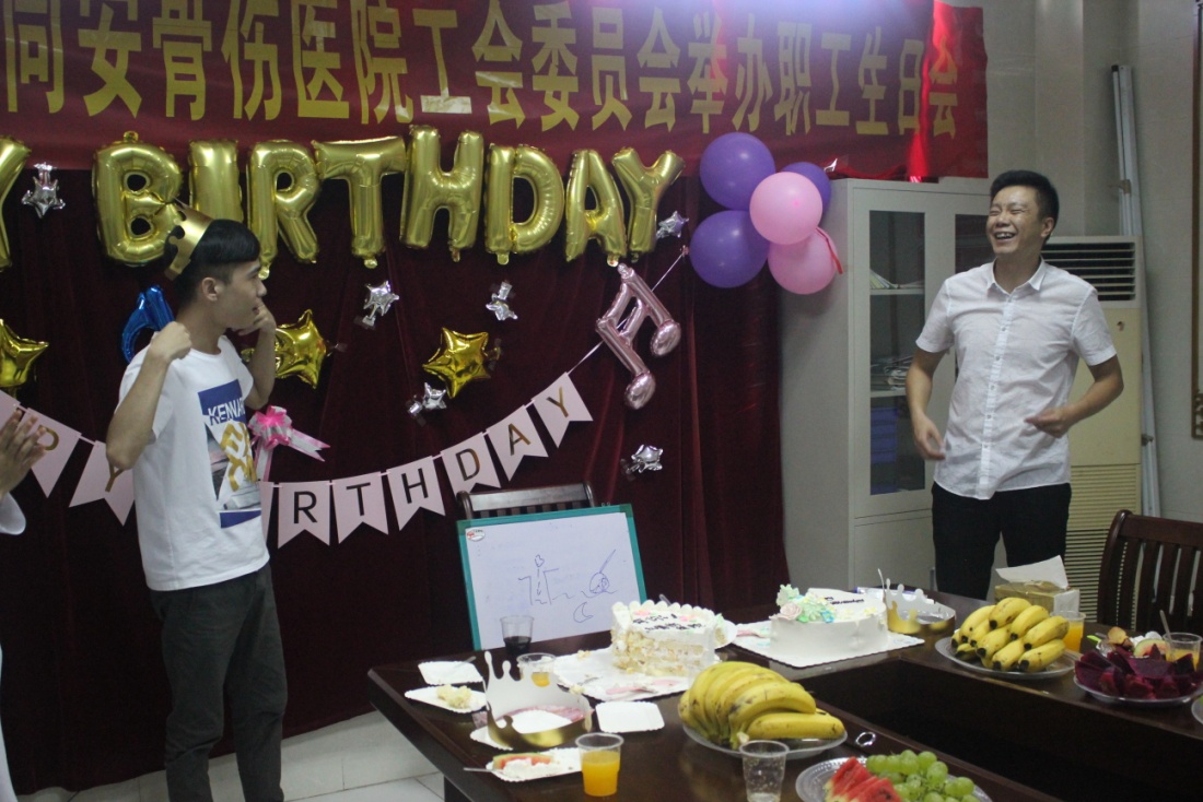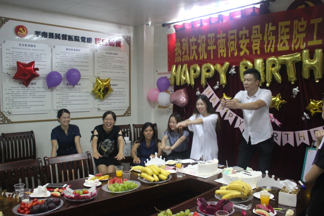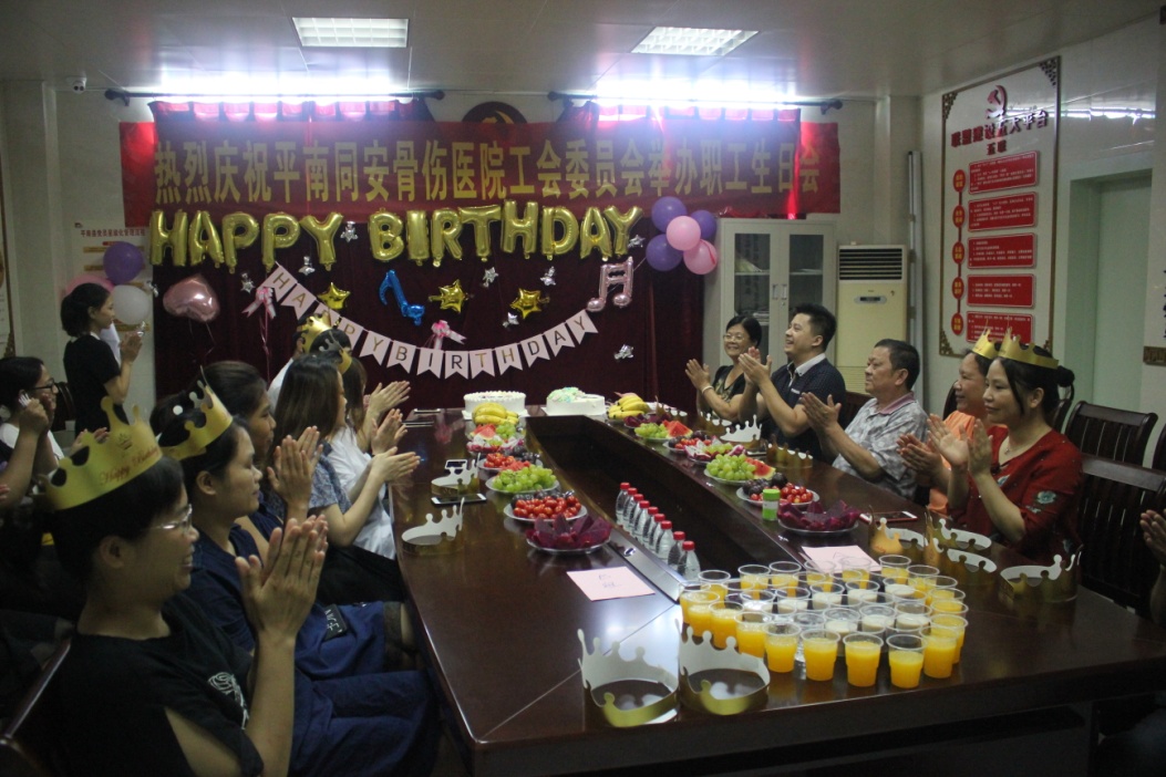 这场集体生日会,不仅有精美的生日蛋糕、贺卡,各种各样的水果和饮料,还有医院董事吴钊亲手为生日的员工们带上生日帽,医院工会主席兼副院长黄晓为大家送上真挚的生日祝福,伴随着优美的旋律,大家齐声欢唱“祝你生日快乐”,共同许下美好的愿望。烛光下洋溢着幸福的笑脸,展现了平南同安骨伤医院员工们胜似一家的温馨氛围。