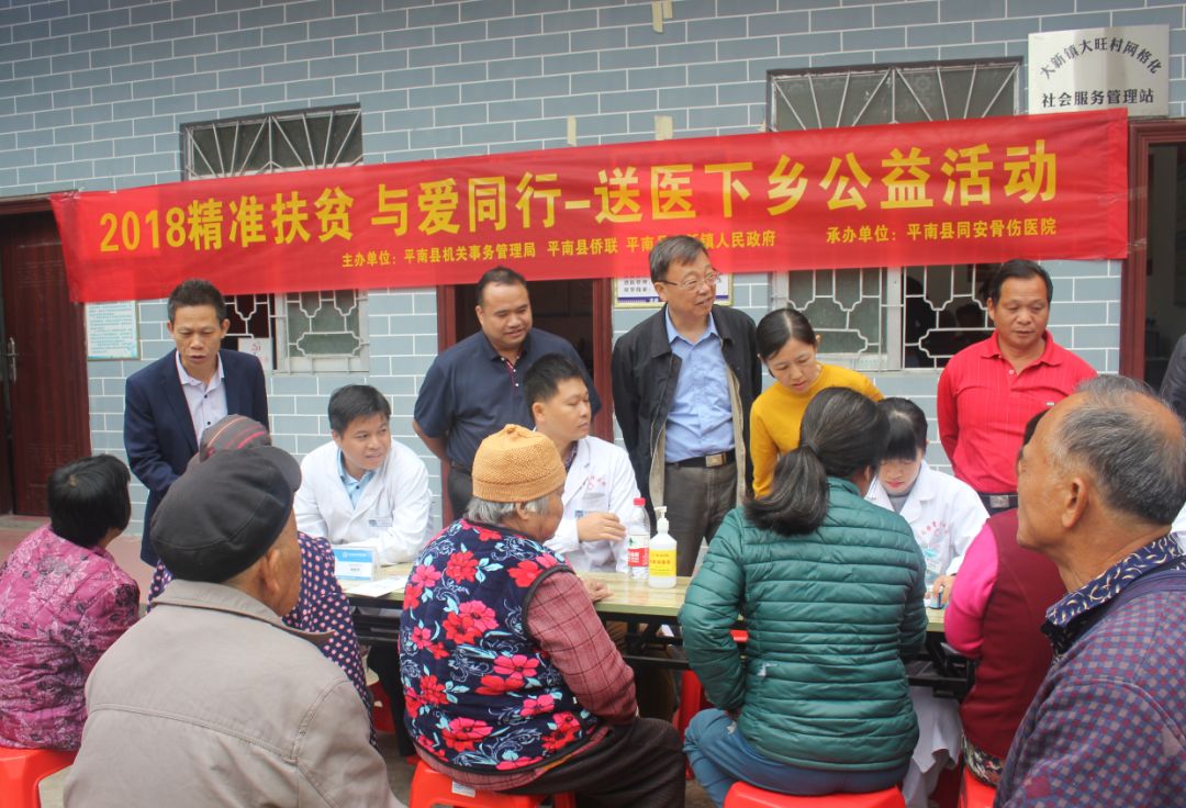 为了全面实施精准扶贫、精准脱贫方略和健康扶贫要求,减少因病致贫、因病返贫现象发生,切实为基层医院及村民解决实际问题,11月8日,县机关事务管理局、县侨联、大新镇人民政府联合平南同安骨伤医院,在大新镇大旺村开展“精准扶贫、与爱同行—送医下乡活动”,受到了广大群众的欢迎。