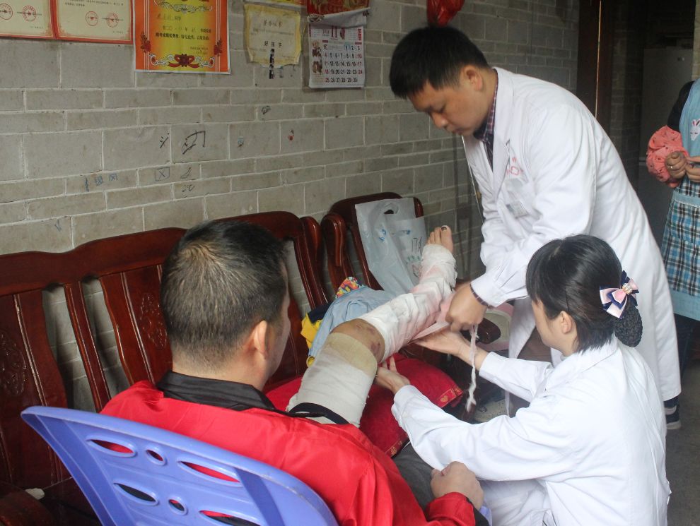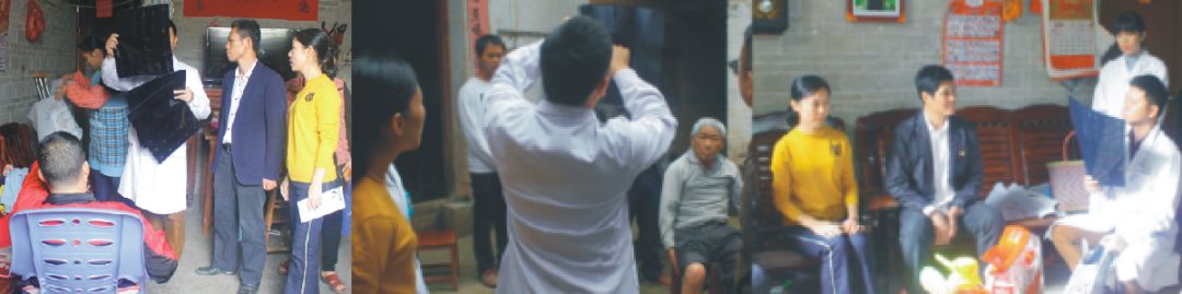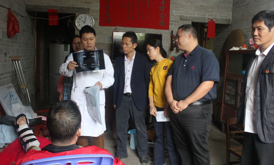 在开展现场义诊活动同时,县机关事务管理局的领导与同安医院的专家们来到村中梁乃振、粟国强、黎钦芳等3个伤病贫困户的家里进行上门慰问和诊断服务,询问这三个贫困患者病情,就下一步的治疗提出意见和建议。